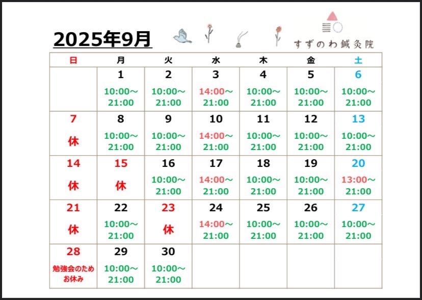 9月の診療日 2025.09.6 今月の診療日 まだまだ暑い日々が続いていますね。 今月も、心を込めて氣血を整えていきます。 Tweet Share +1 Pin it 投稿者: suzunowa 今月の診療日 8月の診療日前の記事 2025年11月の診療日次の記事